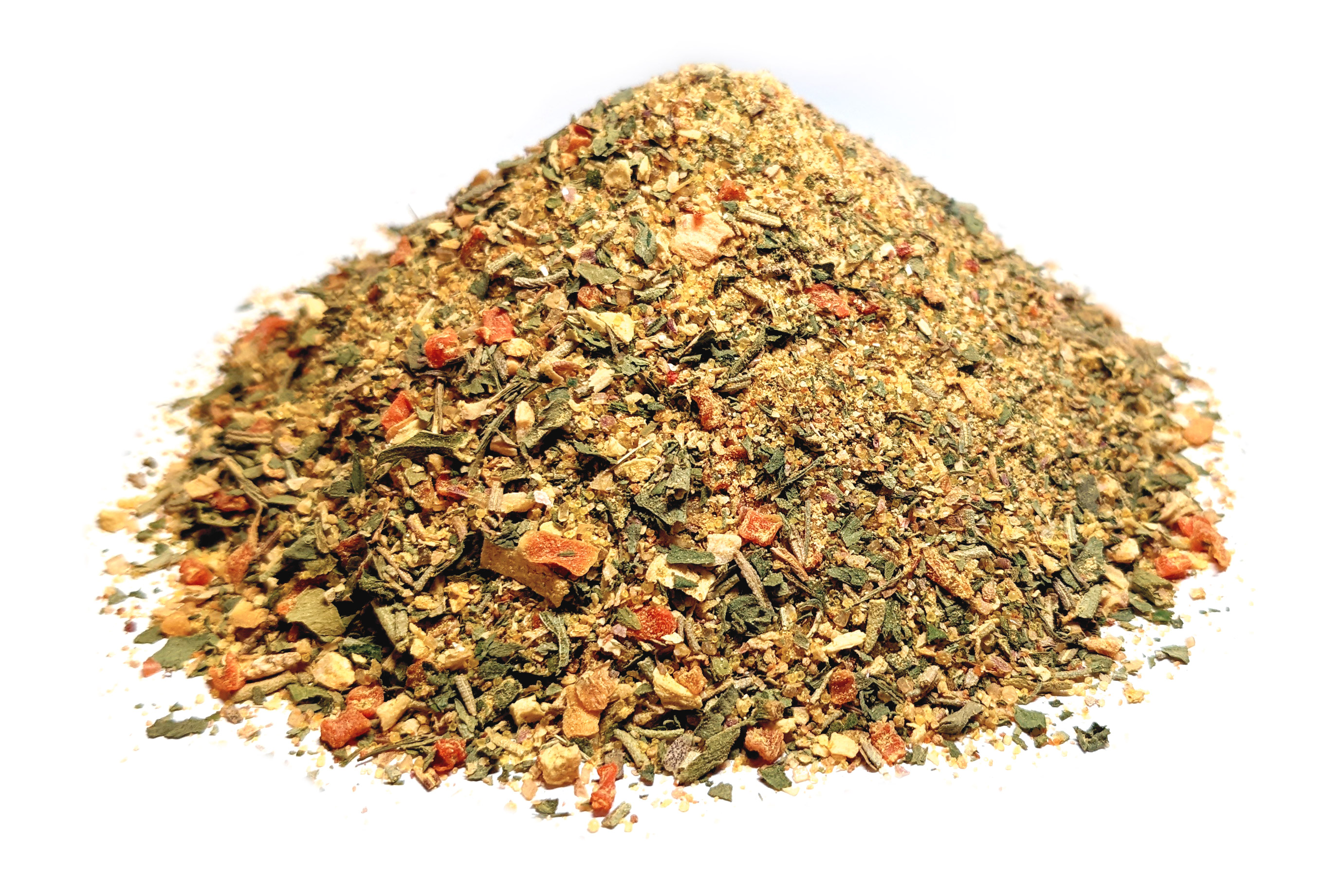 V receptúre nájdete kombináciu sušeného cesnaku a cibule pre guľatý „kuchynský“ základ, byliniek (rozmarín, petržlen, pažítka, medvedí cesnak) pre sviežu zelenú linku a štipku kurkumy pre príjemný teplý tón. Vyvážený podiel soli pomáha jednotlivé chute prepojiť, takže zmes možno použiť ako kompletné dochutenie bez obáv, že pokrm bude fádny alebo naopak presolený – jednoducho pridáte podľa chuti a účelu. Praktickým detailom je aj prídavok vitamínu B2 (riboflavín).
