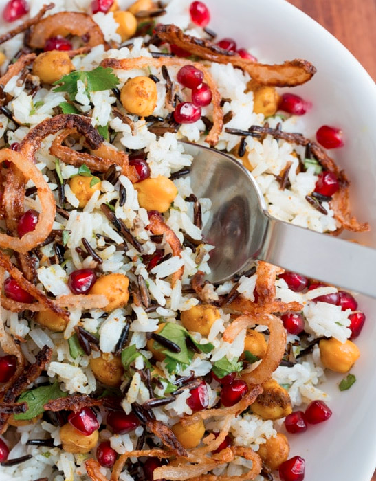 5. Na závěr slijeme vodu z uvařené divoké rýže a přidáme do mísy s rýží basmati a cizrnou. Ochutíme limetkovou šťávou a kůrou, nasekaným koriandrem a granátovým jablkem. Podle potřeby můžeme ještě dosolit nebo přidat pepř. Ozdobíme křupavou cibulkou.