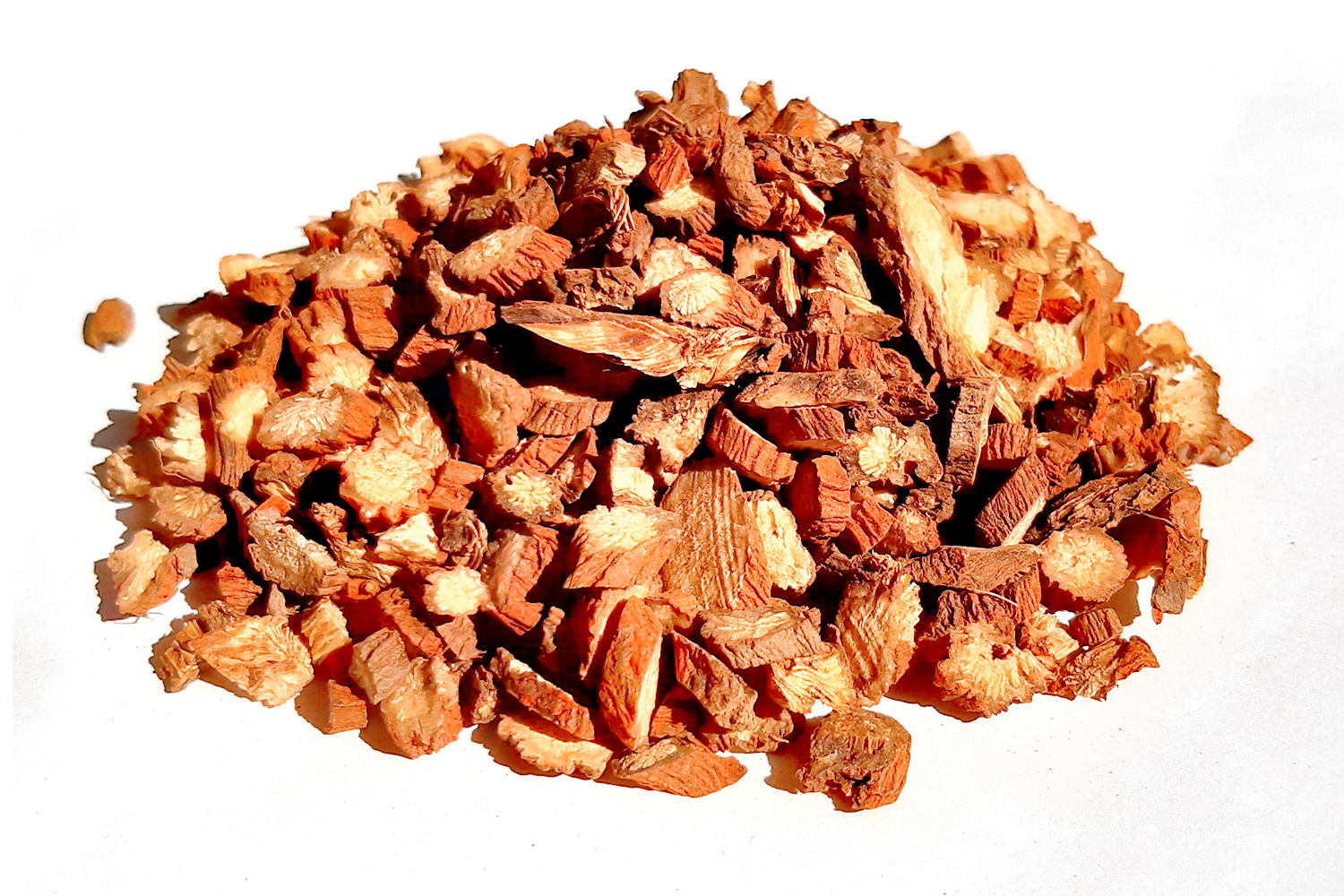 Hledejte suché, čisté kousky kořene bez plísní a cizích příměsí. Správně usušený materiál má hnědočervený až cihlový odstín a lehce pryskyřičnou vůni. Uchovávejte v suchu, temnu a vzduchotěsné nádobě. Pro výraznější nálev lze kořen před přípravou krátce podrťit v hmoždíři – uvolní se tak aromatické látky a získáte plnější barvu i chuť.