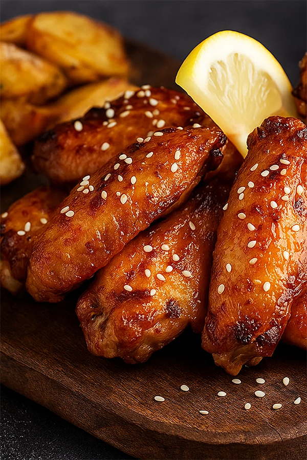 Postup: 1) V mise zmiešajte olej, citrón, med, cesnak a zmes 25 chutí. 2) Pridajte krídelká, dobre premiešajte a nechajte 1–3 hodiny marinovať v chladničke. 3) Pečte pri 200 °C 30–35 minút (na grile stredný žiar 20–25 minút), v polovici otočte a potrite zvyškom marinády. 4) Podávajte s pečenými zemiakmi alebo šalátom; na záver môžete ľahko posypať sezamom.