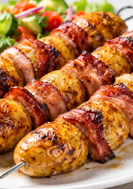 Brambory pečlivě umyjte a osušte – neloupejte. Připravte marinádu ze lžíce oleje, lžíce tvarohu, lžičky smetany a dvou lžiček grilovacího koření. Brambory podélně rozkrojte na půl, ponořte do marinády a nechte 2–3 hodiny odležet v lednici. Anglickou slaninu nakrájejte na čtverečky a střídavě s bramborami napíchejte na grilovací jehly. Grilujte zprudka ze všech stran dozlatova. Podávejte se zeleninovým salátem.