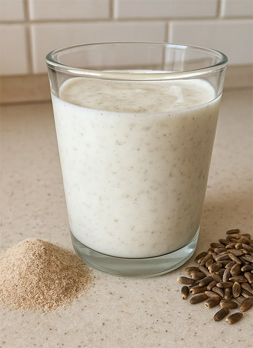 Nejjednodušší je připravit si nápoj: 1–2 čajové lžičky (≈ 5–10 g) rozmíchejte v asi 200 ml vody či džusu, nechte 5 minut nabobtnat a vypijte. Vždy doplňte další sklenicí vody. Směs se hodí i do ranního smoothie, jogurtu nebo kaše. Ideální čas je ráno nalačno nebo večer před jídlem. Pro dlouhodobý efekt užívejte denně; po 8–12 týdnech můžete zařadit krátkou pauzu.